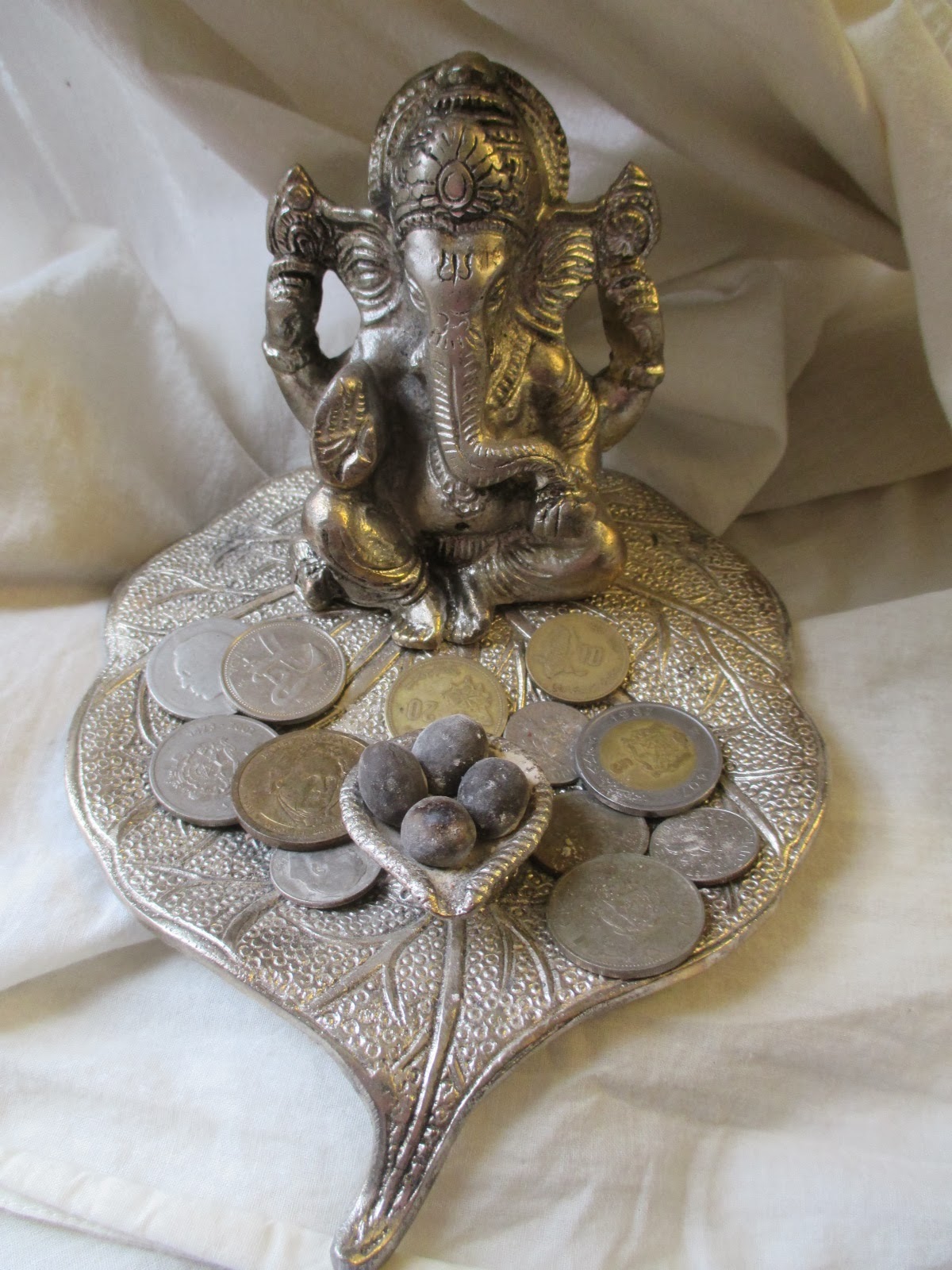 However, when I use coins or dollars from the USA, where I live, this money is put into my Ganesh or Lakshmi pots after the working is finished. Donations from friends and neighbors, who often stop by for supplies, are also put into these pots or dishes. Friends and neighbors can never be charged for supplies, only donations (if they can afford them) will be accepted. By adding to the Lakshmi and Ganesh pots, one blesses themselves in return.